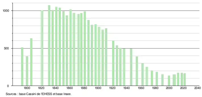 | L'évolution du nombre d'habitants est connue à travers les recensements de la population effectués dans la commune depuis 1793. Pour les communes de moins de 10 000 habitants, une enquête de recensement portant sur toute la population est réalisée tous les cinq ans, les populations légales des années intermédiaires étant quant à elles estimées par interpolation ou extrapolation[33]. Pour la commune, le premier recensement exhaustif entrant dans le cadre du nouveau dispositif a été réalisé en 2007[34]. En 2021, la commune comptait 164 habitants[Note 6], en diminution de 5,2 % par rapport à 2015 (Tarn : +1,82 %, France hors Mayotte : +1,84 %). |