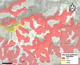 La commune est vulnérable au risque de mouvements de terrains constitué principalement du retrait-gonflement des sols argileux[28]. Cet aléa est susceptible d'engendrer des dommages importants aux bâtiments en cas d’alternance de périodes de sécheresse et de pluie. 58,1 % de la superficie communale est en aléa moyen ou fort (76,3 % au niveau départemental et 48,5 % au niveau national). Sur les 168 bâtiments dénombrés sur la commune en 2019, 149 sont en aléa moyen ou fort, soit 89 %, à comparer aux 90 % au niveau départemental et 54 % au niveau national. Une cartographie de l'exposition du territoire national au retrait gonflement des sols argileux est disponible sur le site du BRGM[29],[Carte 3].
