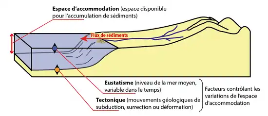 Dans les milieux marins, les changements d'accommodation sur de longues échelles de temps sont principalement déterminés par la tectonique et par les variations eustatiques[3].