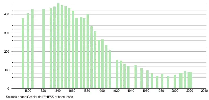 L'évolution du nombre d'habitants est connue à travers les recensements de la population effectués dans la commune depuis 1793. Pour les communes de moins de 10 000 habitants, une enquête de recensement portant sur toute la population est réalisée tous les cinq ans, les populations légales des années intermédiaires étant quant à elles estimées par interpolation ou extrapolation[38]. Pour la commune, le premier recensement exhaustif entrant dans le cadre du nouveau dispositif a été réalisé en 2008[39].