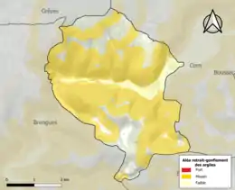 Le retrait-gonflement des sols argileux est susceptible d'engendrer des dommages importants aux bâtiments en cas d’alternance de périodes de sécheresse et de pluie. 70,9 % de la superficie communale est en aléa moyen ou fort (67,7 % au niveau départemental et 48,5 % au niveau national). Sur les 105 bâtiments dénombrés sur la commune en 2019, 78 sont en aléa moyen ou fort, soit 74 %, à comparer aux 72 % au niveau départemental et 54 % au niveau national. Une cartographie de l'exposition du territoire national au retrait gonflement des sols argileux est disponible sur le site du BRGM[33],[Carte 2].