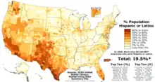D'autre part, selon le Pew Hispanic Center[17] 76 % des 11,9 millions d'immigrants sans papiers aux États-Unis sont hispaniques (9 millions), dont certains n'ont pas encore été enregistrés dans le recensement.