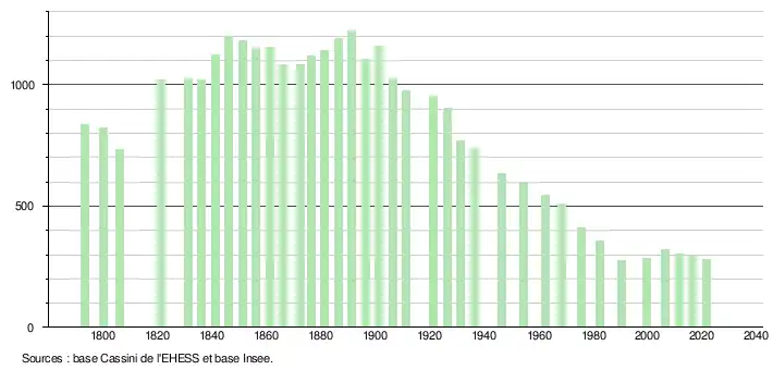Elle a accueilli jusqu'à 1 220 habitants à la fin du XIXe siècle et a connu un déclin démographique jusqu'en 1990, déclin essentiellement lié à l'exode rural, avant d'observer, depuis la fin du XXe siècle, un phénomène de retour à la vie rurale, dont la commune semble bénéficier.