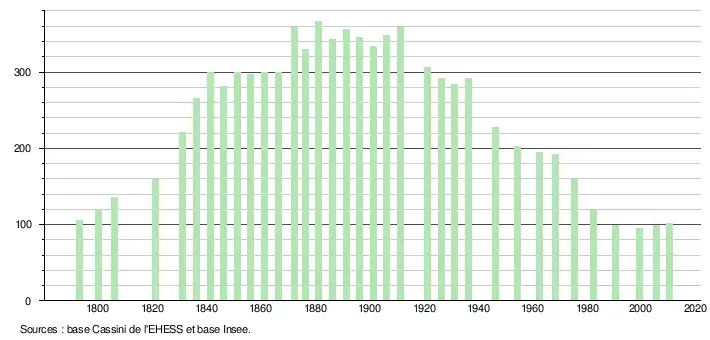 L'évolution du nombre d'habitants est connue à travers les recensements de la population effectués dans la commune depuis 1793. À partir du , les populations légales des communes sont publiées annuellement dans le cadre d'un recensement qui repose désormais sur une collecte d'information annuelle, concernant successivement tous les territoires communaux au cours d'une période de cinq ans. Pour les communes de moins de 10 000 habitants, une enquête de recensement portant sur toute la population est réalisée tous les cinq ans, les populations légales des années intermédiaires étant quant à elles estimées par interpolation ou extrapolation[3]. Pour la commune, le premier recensement exhaustif entrant dans le cadre du nouveau dispositif a été réalisé en 2005[4],[Note 1].