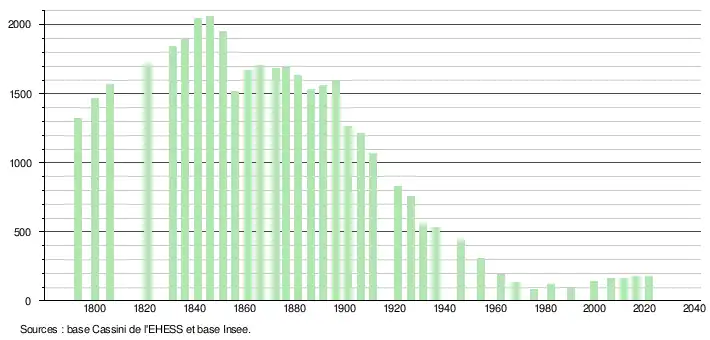 L'évolution du nombre d'habitants est connue à travers les recensements de la population effectués dans la commune depuis 1793. Pour les communes de moins de 10 000 habitants, une enquête de recensement portant sur toute la population est réalisée tous les cinq ans, les populations légales des années intermédiaires étant quant à elles estimées par interpolation ou extrapolation[50]. Pour la commune, le premier recensement exhaustif entrant dans le cadre du nouveau dispositif a été réalisé en 2006[51].