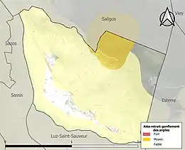 Le retrait-gonflement des sols argileux est susceptible d'engendrer des dommages importants aux bâtiments en cas d’alternance de périodes de sécheresse et de pluie. 8,2 % de la superficie communale est en aléa moyen ou fort (44,5 % au niveau départemental et 48,5 % au niveau national). Sur les 251 bâtiments dénombrés sur la commune en 2019, 3 sont en aléa moyen ou fort, soit 1 %, à comparer aux 75 % au niveau départemental et 54 % au niveau national. Une cartographie de l'exposition du territoire national au retrait gonflement des sols argileux est disponible sur le site du BRGM[44],[Carte 3].