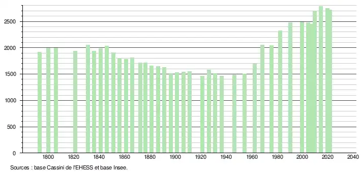 L'évolution du nombre d'habitants est connue à travers les recensements de la population effectués dans la commune depuis 1793. Pour les communes de moins de 10 000 habitants, une enquête de recensement portant sur toute la population est réalisée tous les cinq ans, les populations légales des années intermédiaires étant quant à elles estimées par interpolation ou extrapolation[25]. Pour la commune, le premier recensement exhaustif entrant dans le cadre du nouveau dispositif a été réalisé en 2004[26].