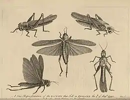 En 1747-1748, des criquets envahissent la Valachie, la Moldavie, la Transylvanie, la Pologne et la Hongrie[3]. En 1748, des Criquets migrateurs ont envahi l'Angleterre[4].