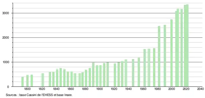 L'évolution du nombre d'habitants est connue à travers les recensements de la population effectués dans la commune depuis 1793. Pour les communes de moins de 10 000 habitants, une enquête de recensement portant sur toute la population est réalisée tous les cinq ans, les populations légales des années intermédiaires étant quant à elles estimées par interpolation ou extrapolation[26]. Pour la commune, le premier recensement exhaustif entrant dans le cadre du nouveau dispositif a été réalisé en 2008[27].