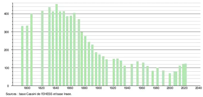 L'évolution du nombre d'habitants est connue à travers les recensements de la population effectués dans la commune depuis 1793. Pour les communes de moins de 10 000 habitants, une enquête de recensement portant sur toute la population est réalisée tous les cinq ans, les populations légales des années intermédiaires étant quant à elles estimées par interpolation ou extrapolation[15]. Pour la commune, le premier recensement exhaustif entrant dans le cadre du nouveau dispositif a été réalisé en 2008[16].