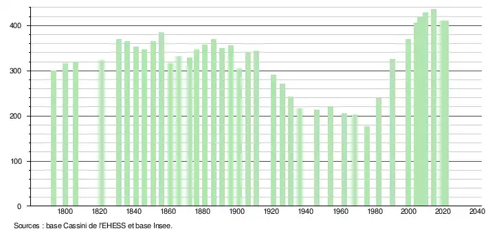 L'évolution du nombre d'habitants est connue à travers les recensements de la population effectués dans la commune depuis 1793. Pour les communes de moins de 10 000 habitants, une enquête de recensement portant sur toute la population est réalisée tous les cinq ans, les populations légales des années intermédiaires étant quant à elles estimées par interpolation ou extrapolation[21]. Pour la commune, le premier recensement exhaustif entrant dans le cadre du nouveau dispositif a été réalisé en 2004[22].
