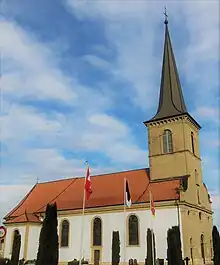 L'église actuelle a été commencée en 1842 pour s'achever en 1847. Elle a été placée légèrement plus au sud que la précédente et disposée à l'inverse de ce qui se fait d'habitude, c'est-à-dire l'entrée à l'est, et le chœur à l'ouest. Le maître-autel est monumental et l'église est précédée, sous la tour, d'une sorte de vestibule. De plus, particularité qui ne se trouve pas ailleurs, il y a trois arcs de pierre à la tribune, dont l'un, celui du milieu, encadre la tuyauterie de l'orgue. Le nouveau sanctuaire a été consacré le .