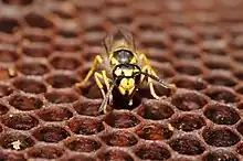 Guêpe sur un rayon de nid d'abeilles.