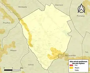 Le retrait-gonflement des sols argileux est susceptible d'engendrer des dommages importants aux bâtiments en cas d’alternance de périodes de sécheresse et de pluie. 9,3 % de la superficie communale est en aléa moyen ou fort (19,2 % au niveau départemental et 48,5 % au niveau national). Sur les 308 bâtiments dénombrés sur la commune en 2019, 55 sont en aléa moyen ou fort, soit 18 %, à comparer aux 17 % au niveau départemental et 54 % au niveau national. Une cartographie de l'exposition du territoire national au retrait gonflement des sols argileux est disponible sur le site du BRGM[20],[Carte 2].