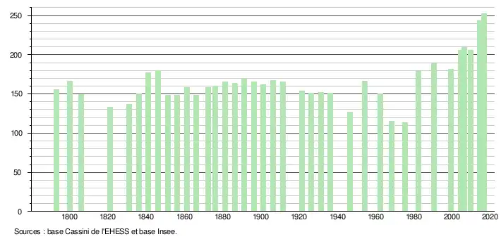 L'évolution du nombre d'habitants est connue à travers les recensements de la population effectués dans la commune depuis 1793. Pour les communes de moins de 10 000 habitants, une enquête de recensement portant sur toute la population est réalisée tous les cinq ans, les populations légales des années intermédiaires étant quant à elles estimées par interpolation ou extrapolation[28]. Pour la commune, le premier recensement exhaustif entrant dans le cadre du nouveau dispositif a été réalisé en 2004[29].