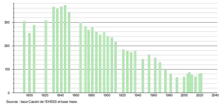 L'évolution du nombre d'habitants est connue à travers les recensements de la population effectués dans la commune depuis 1793. Pour les communes de moins de 10 000 habitants, une enquête de recensement portant sur toute la population est réalisée tous les cinq ans, les populations légales des années intermédiaires étant quant à elles estimées par interpolation ou extrapolation[17]. Pour la commune, le premier recensement exhaustif entrant dans le cadre du nouveau dispositif a été réalisé en 2004[18].