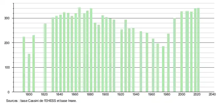 L'évolution du nombre d'habitants est connue à travers les recensements de la population effectués dans la commune depuis 1793. Pour les communes de moins de 10 000 habitants, une enquête de recensement portant sur toute la population est réalisée tous les cinq ans, les populations légales des années intermédiaires étant quant à elles estimées par interpolation ou extrapolation[21]. Pour la commune, le premier recensement exhaustif entrant dans le cadre du nouveau dispositif a été réalisé en 2007[22].