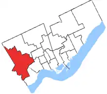 - Une partie de la région métropolitaine de Toronto délimitée par Dundas Street, Jane Street, Eglinton Avenue West, la rivière Humber, Dixon Side Road, Islington Avenue North, Rexdale Boulevard, Kipling Avenue North, la Queen Elizabeth Way et Kipling Avenue South.