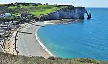 Étretat est une commune balnéaire et touristique située le long de la Manche, sur la côte d'Albâtre, proche de l'estuaire de la Seine, marquée par ses falaises et célèbre pour ses trois arches successives.