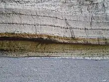 Les falaises d'Étretat sont constituées de calcaire du Crétacé, c'est-à-dire, pour l'essentiel, de la craie blanche à silex du Sénonien[4], plus précisément du Turonien au Coniacien[5]. Il n'y a pas d'autres minéraux, contrairement à ce que l'on observe ailleurs sur ce même littoral cauchois (par exemple le grès dans le nord du département de Seine-Maritime, aux environs de Dieppe), ni de calcaire oolithique du Jurassique comme celui des falaises du Calvados qui est de teinte plus jaune. On y distingue donc uniquement les strates régulières de silex, ce qui explique la présence de galets sur la plage. En effet, à la suite de l'effondrement de pans de falaise, le calcaire et le silex se trouvent au contact de l'eau de mer qui dissout le calcaire et l'action des vagues polit le silex pour en faire des galets.