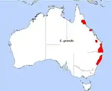 E. grandis pousse dans les zones côtières et sous-côtière s'étendant de Newcastle en Nouvelle-Galles du Sud vers le nord jusqu'à l'ouest de Daintree dans le Queensland, essentiellement sur terrain plat et à faibles pentes.