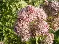 Les inflorescences sont des racèmes corymbiformes de capitules, terminaux, compacts, en têtes pourprées aux fleurons blancs, rosés ou purpurins. La floraison a lieu à la fin de l'été, au début d'automne.
