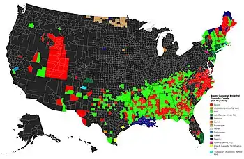 D'après le Bureau du recensement des États-Unis, les Germano-Américains (20,7 %)[15], les Irlando-Américains (15,6 %)[16], les Anglo-Américains (14,3 %)[17],[18],[19]forment ensemble plus de (50,6 %) de la population blanche d'origine européenne.