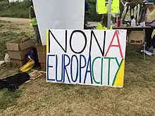 L'opposition à ce projet prend de l'ampleur avec des manifestations en mai 2017, puis en mai 2018[76], en considérant l'aspect symbolique de l'artificialisation des sols dans une région déjà très fortement touchée par ce phénomène[77]. Cependant, le triangle de Gonesse représente une zone de 750 hectares et dans le cadre de l'aménagement du territoire réclamé par l'État, 400 hectares ont été "sanctuarisés" par l’État. Seuls 280 hectares seraient aménagés, dont seulement 80 pour Europacity[78],[79].