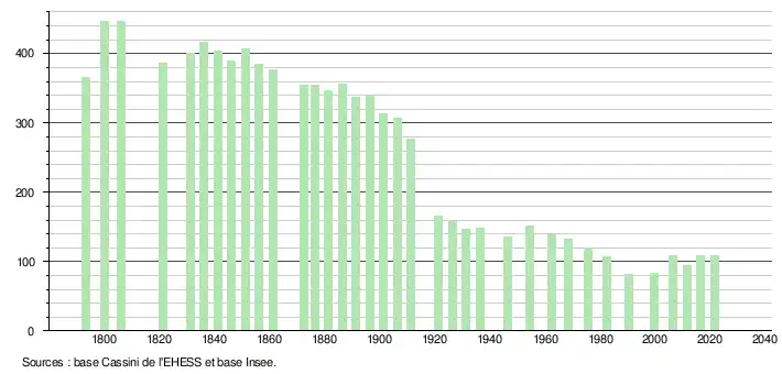 L'évolution du nombre d'habitants est connue à travers les recensements de la population effectués dans la commune depuis 1793. Pour les communes de moins de 10 000 habitants, une enquête de recensement portant sur toute la population est réalisée tous les cinq ans, les populations légales des années intermédiaires étant quant à elles estimées par interpolation ou extrapolation[26]. Pour la commune, le premier recensement exhaustif entrant dans le cadre du nouveau dispositif a été réalisé en 2006[27].