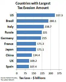 Selon le journal de 20 heures de France 2 du jeudi (dix-neuvième minute)[source insuffisante], l'évasion fiscale est évaluée à 50 milliards d'euros par an en France, 120 milliards d'euros en Italie, et 240 milliards en Allemagne.