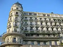 Sa construction est confiée à l'architecte Sébastien-Marcel Biasini (1841-1913) et l'architecte François-Félix Gordolon (1852-1901) pour la partie métallique, il dessina les fers forgés, la couronne qui surmontait les appartements de la Reine et la décoration intérieure, Gustave Eiffel l'aida pour aller plus vite en offrant la réalisation de la couronne. La superficie de l'édifice est de 6 260 m2 répartie sur cinq étages (plus un sixième sous les combles) avec une longueur totale de façade de 150 mètres[4] (façade sud de 104 mètres et façade sud-est de 45 mètres). La conception de l'ensemble repose sur des techniques de décoration caractéristiques dite de la Belle Époque. Les façades sont traitées par l'accumulation de plusieurs ornements (placages de relief en stucs, oriels verticaux, combles surmontés de coupole, marquises de verre, touche d'orientalisme…) ce qui donne au futur hôtel un aspect de luxe omniprésent[5]. La couronne en fer forgé qui surplombe l'aile gauche qui abrite les appartements de la reine Victoria a été conçue et réalisée selon les plans de François-Félix Gordolon (1852-1901).