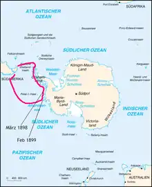 Malgré la saison qui avance, il est décidé de poursuivre l'exploration plus au Sud ; le navire se retrouvera prisonnier des glaces quelques semaines plus tard près de l'île Pierre Ier, et dérivera en mer de Bellingshausen pendant les treize mois qui suivirent. L'expédition devint donc la première à hiverner officiellement dans la région Antarctique[1]. En effet, des chasseurs de phoques avaient préalablement hiverné de force sur l'île du Roi-George dans les îles Shetland du Sud en 1821[1].