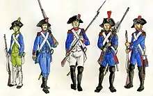 (uniforme à revers rouges pour le régiment d'Hervilly et à revers bleus pour le Royal-Louis.)
