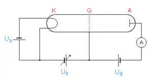 Dans l'expérience, Franck et Hertz ont fait circuler un faisceau d'électrons dans un tube à vide contenant du mercure gazeux. Pour y arriver, ils ont utilisé une triode, c'est-à-dire un dispositif composée d'une cathode, d'une grille polarisée et d'une anode.
