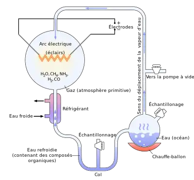 En 1953, Stanley Miller, accompagné de Harold Urey, a voulu reproduire les conditions de la Terre primitive. Ils ont enfermé dans un ballon des gaz (méthane CH4, ammoniac NH3, hydrogène H2 et eau H2O) et soumis le mélange à des décharges électriques pendant sept jours.