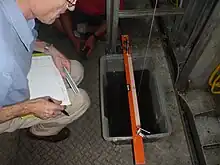 - Un densimètre permet de mesurer la densité d'un échantillon d'eau prélevé sur le lieu de l'opération, cette donnée est essentielle car elle permet de calculer la masse du volume déplacé et donc le poids du navire, les échantillons doivent être prélevés au niveau des tirants d'eau arrière, avant et milieu, à une profondeur suffisante pour ne pas être affectés par les variations de densité des eaux de surface.