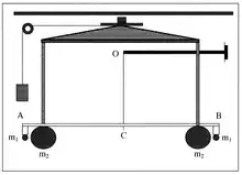 Vers la fin du XVIIIe siècle, John Michell ouvrit la voie à une telle mesure directe de G au laboratoire, évitant les incertitudes attachées aux estimations de l'effet de grandes entités géologiques comme celles impliquées dans les expériences de déviations de la verticale provoquées par des montagnes ou dans les mesures de différences de la pesanteur entre le sommet et le fond d'une mine. Michell construisit une balance de torsion afin de mesurer directement la force d'attraction F s'exerçant entre deux sphères pleines de masses m1 et m2. Si d désigne la distance entre les centres de masse respectifs de ces sphères, la loi d'attraction universelle de Newton requiert que F = G m1m2/d2. En mesurant F, m1, m2 et d, on obtient G. L'appareil de Michell comprenait une barre horizontale AB, de centre C, d'une longueur de 6 pieds, suspendue à un point fixe O au moyen d'un fil vertical OC dont la longueur est de 40 pouces (environ 102 cm). Des sphères de plomb de 2 pouces de diamètre, donc de masse m1 valant[alpha 5](4π/3) (2 x 2,54/2)3 x 11,34 ≅ 778,4 grammes, étaient suspendues en A et B au moyen de deux fils de fer très courts. Cet équipage était logé dans une étroite armoire en bois. À l'extérieur de cette armoire, Michell avait prévu la possibilité d'amener un système composé de deux grosses boules de plomb de 8 pouces de diamètre, chacune ayant une masse 43 fois supérieure à une petite sphère, c'est-à-dire près de 50 kilogrammes (exactement 49,8176 kg). Ces deux grosses masses m2 se placent de part et d'autre du plan OAB, à proximité des deux petites masses m1 de manière que dans chaque couple (m1, m2) les masses s'attirent chacune avec une force F = Gm1m2/d2 agissant approximativement dans une direction horizontale, perpendiculairement au plan OAB. Le fil OC est ainsi tordu par un couple horizontal d'un angle ϑ, que l'on peut mesurer par exemple à l'aide d'un système optique. Soit k la raideur en torsion du fil OC. A l'équilibre on a donc kϑ = 2Gm1m2/d2, d'où l'on peut tirer G = kϑd2/(2m1m2), à condition de pouvoir mesurer la raideur du fil de torsion. Pour ce faire, on évalue le moment d'inertie de l'équipage m1ABm1, soit I1, par rapport à l'axe OC et on mesure dans une expérience auxiliaire la période d'oscillation de cet équipage autour de OC lorsque le système des grosses boules de masses m2 se trouve éloigné. Si T1 désigne cette période, on a k = 4π2I1/T12. Ainsi, la constante G est caractérisée en termes des quantités mesurables m1, m2, L, d, ϑ, I1 et T1.