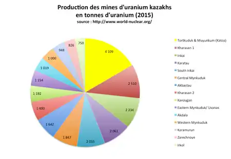 En 2015, le Kazakhstan produit environ 23 800 tonnes soit 39 % de l'uranium mondial[8]. Il y a alors 17 mines d'uranium dans le pays[9].