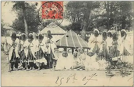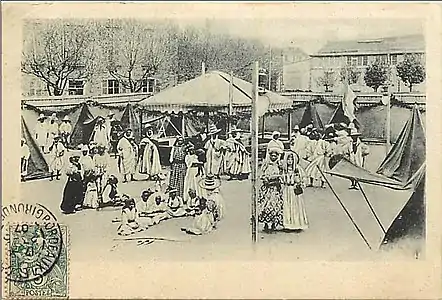 - Le Village africain : Aussi étonnant que cela puisse paraître aujourd’hui, le village africain fut visité par plusieurs centaines de personnes chaque jour. On y voyait un personnel de quatre-vingts à quatre-vingt-dix personnes, hommes, femmes et enfants, appartenant à quatre ethnies de l'Afrique du Nord, des Soudanais, des Sud-Oranais, des Chambas et des Ouled Naïl formant ensemble un « Village africain ».
