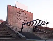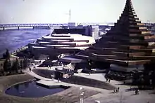 - Trois grands bâtiments cubiques, chacun arborant une couleur primaire, constituent l’ensemble du pavillon et sont remarqués pour leur simplicité, qui semble tout à fait de bon goût et appropriée[13].