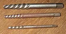 Cet extracteur nécessite également un alésage de la pièce à extraire avec un foret, mais l'extracteur est inséré en le frappant avec un marteau en laiton, afin de ne pas le briser.