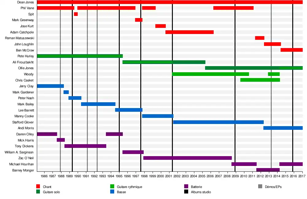 - Phil Vane - chant (1985–1989, 1989-1996, 1997–1999, 2006–2011 ; décédé en 2011)