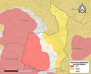 Le retrait-gonflement des sols argileux est susceptible d'engendrer des dommages importants aux bâtiments en cas d’alternance de périodes de sécheresse et de pluie. 83 % de la superficie communale est en aléa moyen ou fort (67,4 % au niveau départemental et 48,5 % au niveau national). Sur les 375 bâtiments dénombrés sur la commune en 2019, 295 sont en aléa moyen ou fort, soit 79 %, à comparer aux 84 % au niveau départemental et 54 % au niveau national. Une cartographie de l'exposition du territoire national au retrait gonflement des sols argileux est disponible sur le site du BRGM[18],[Carte 2].
