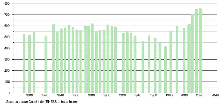 L'évolution du nombre d'habitants est connue à travers les recensements de la population effectués dans la commune depuis 1793. Pour les communes de moins de 10 000 habitants, une enquête de recensement portant sur toute la population est réalisée tous les cinq ans, les populations légales des années intermédiaires étant quant à elles estimées par interpolation ou extrapolation[22]. Pour la commune, le premier recensement exhaustif entrant dans le cadre du nouveau dispositif a été réalisé en 2005[23].