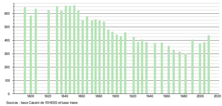 L'évolution du nombre d'habitants est connue à travers les recensements de la population effectués dans la commune depuis 1793. À partir du , les populations légales des communes sont publiées annuellement dans le cadre d'un recensement qui repose désormais sur une collecte d'information annuelle, concernant successivement tous les territoires communaux au cours d'une période de cinq ans. Pour les communes de moins de 10 000 habitants, une enquête de recensement portant sur toute la population est réalisée tous les cinq ans, les populations légales des années intermédiaires étant quant à elles estimées par interpolation ou extrapolation[9]. Pour la commune, le premier recensement exhaustif entrant dans le cadre du nouveau dispositif a été réalisé en 2004[10],[Note 1].