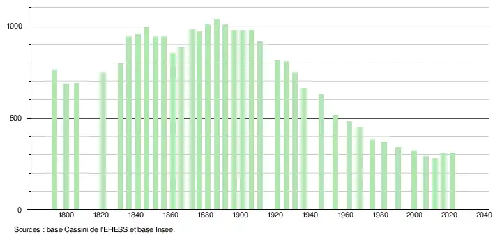 L'évolution du nombre d'habitants est connue à travers les recensements de la population effectués dans la commune depuis 1793. Pour les communes de moins de 10 000 habitants, une enquête de recensement portant sur toute la population est réalisée tous les cinq ans, les populations légales des années intermédiaires étant quant à elles estimées par interpolation ou extrapolation[17]. Pour la commune, le premier recensement exhaustif entrant dans le cadre du nouveau dispositif a été réalisé en 2006[18].