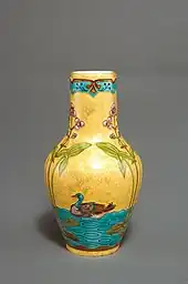 - Charles Ficquenet : imitation d'un vase chinois en céladon avec des décors torsadés dans la pâte. Au départ, ce modèle s'est vendu sous la forme de deux grands vases sans fond montés en lampes, d'une couleur bleu éclatante. Ensuite plusieurs séries de vases plus petits faits à partir de moules sortiront jusque dans les années 1950. La plupart sont vert céladon.