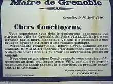 Mais Félix Viallet ne va pas terminer son mandat. Souhaitant se présenter aux prochaines élections législatives, il se rend à une réunion publique à Voiron le où il meurt brutalement à l'âge de 70 ans. Il venait de scander à la foule « Ce qu'il faut au pays, c'est moins de politique, ce qu'il lui faut, ce sont des finances saines... ». Soudain, après ces paroles, il s'affaisse, mort[14]. Par un singulier hasard, la ligne électrique de 60 000 volts dont il était l'un des administrateurs est mise sous tension le lendemain de sa mort[15].