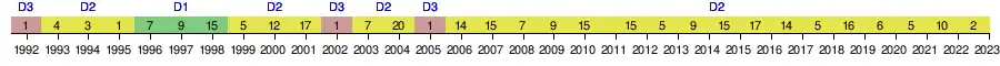| 1995 | 1er | 92 | 42 | 29 | 5 | 8 | 83 | 30 | +53 | 32es de finale | |