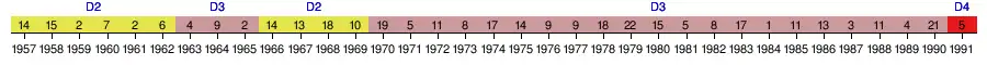 | 1957 | 2e Zone 2 | 14e | 27 | 34 | 9 | 9 | 16 | 35 | 57 | -22 | Finale Q |